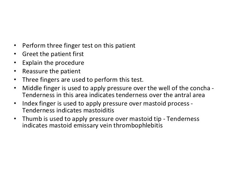 PPT Physical assessment PowerPoint Presentation, free download ID - Inspect the external auditory canal with the otoscope for discharge, color, and consistency of cerumen. Keep one finger at cymba conchae, second finger over posterior border of mastoid and third finger at mastoid tip. Palpate the auricle and mastoid process for tenderness. The 3 finger test mastoid tenderness is essentially a diagnostic tool used to check for tenderness in the. You should also read this: 11 Panel Drug Test Near Me