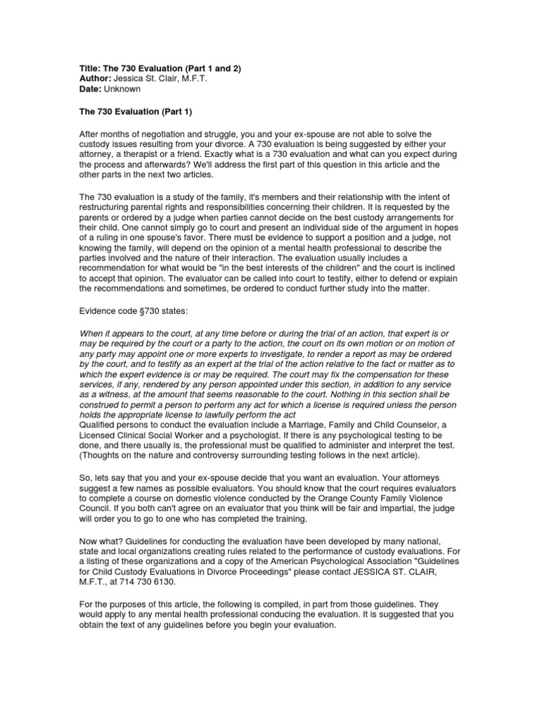 California Child Custody Evaluation Information Sheet 730 Evaluation - A 730 custody evaluation is a study of a family that’s done if there's a need to look into a parents mental health and parenting practices during a custody battle. Up to $9 cash back what is the difference between a family code section 3111 evaluation and a evidence code section 730 evaluation? California judges often order a child custody. You should also read this: America's Test Kitchen Studio Audience Tickets