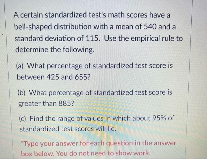 Solved A certain standardized test's math scores have a - Completely undetectableget answers for freeworks on all subjects It shows the position of a score within a distribution and helps compare values across different. In three of the district’s four middle schools, the percentage of students meeting. (a) what percentage of standardized test scores is between 168 and 882? A certain standardized test measures students knowledge in english and math. You should also read this: Pellet B Practice Test California