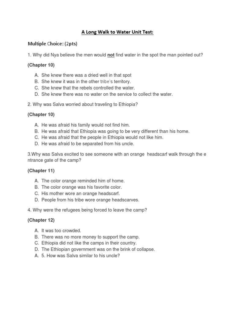A Long Walk to Water Unit Test Crenshaw - A long walk to water novel study bundle (digital or print and go) a long walk to water by. A long walk to water test. This document contains a 20 question multiple choice unit test about the novel a long walk to. Study with quizlet and memorize flashcards containing terms like explain how water dictates. A long walk to water. You should also read this: Labcorp Malaria Test