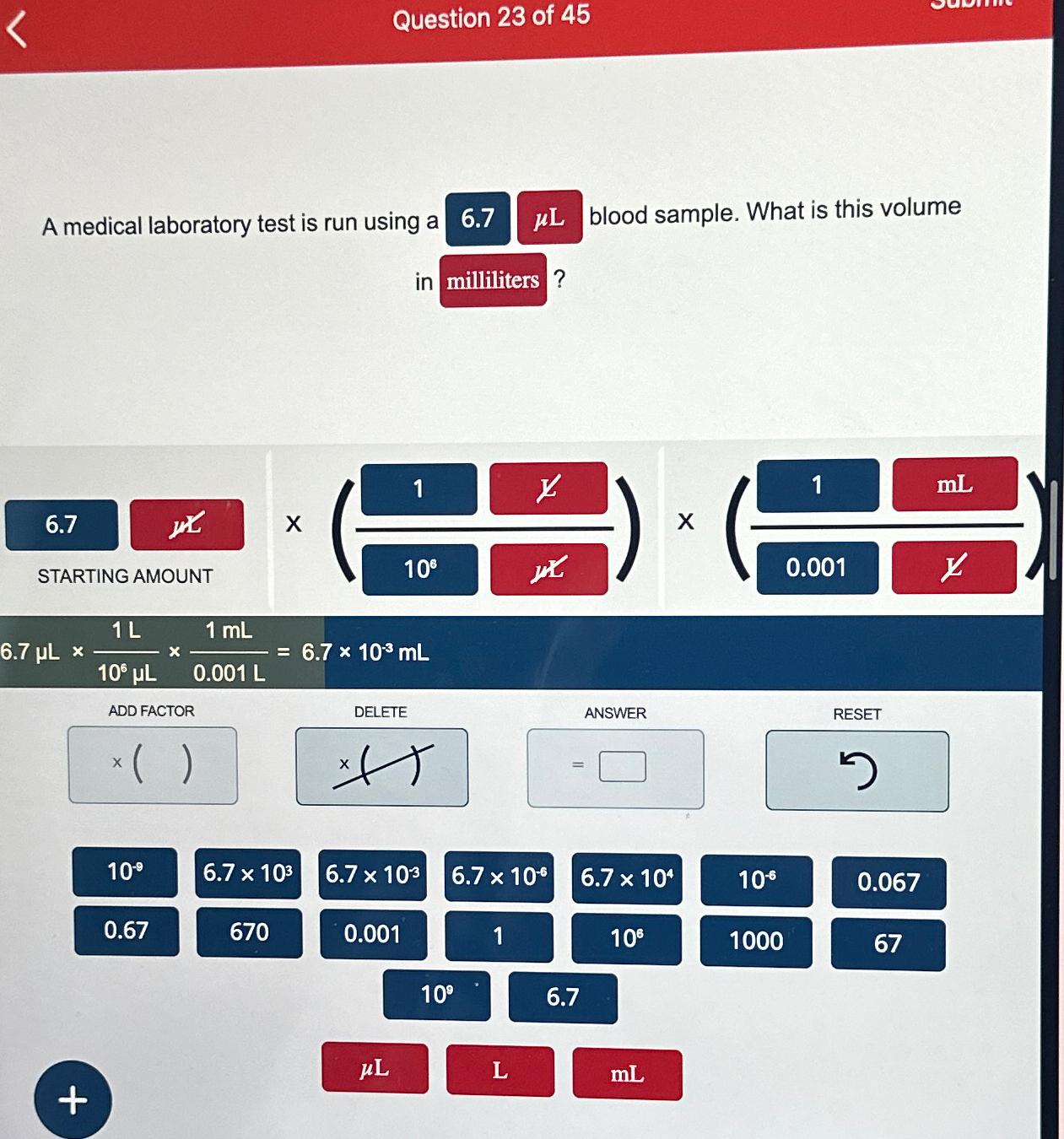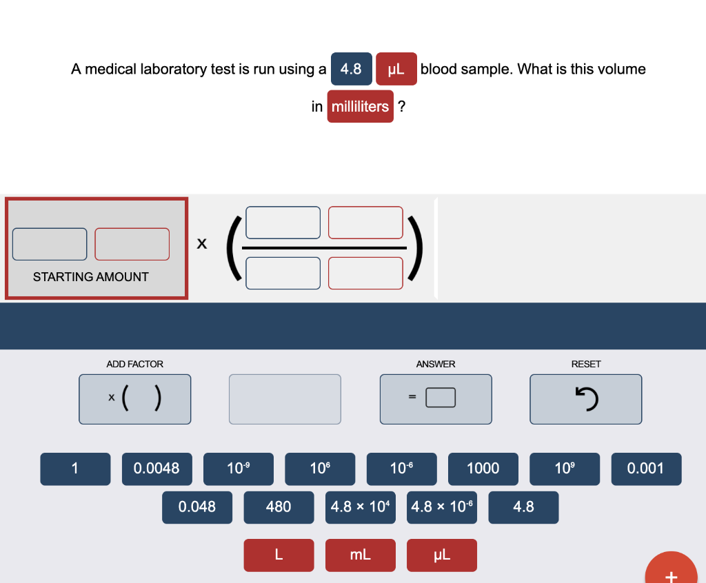 Solved A medical laboratory test is run using a 4.8 UL blood - A medical laboratory test is run using a 4.8 nl blood sample. What is this volume in milliliters? 4.8 x 10³ 1 4.8 x 10 1.0 x 10⁹ 1000 1.0 x 10€ μl 480 0.48 l 1.0 * 10⁰ 48 4.8 0.048 0.001 4.8 ×. Here’s the best way to solve it. A medical laboratory test is run using a. You should also read this: Free Oar Practice Test