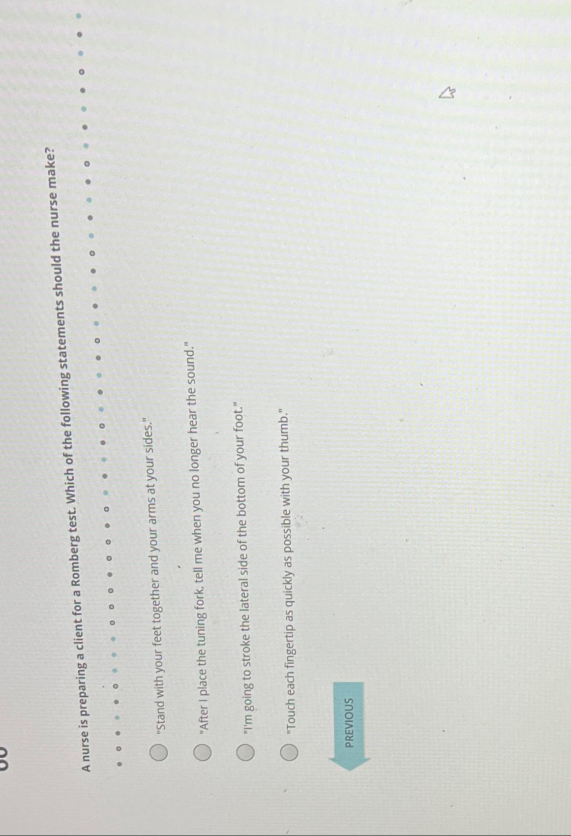 Solved A nurse is preparing a client for a Romberg test. - Which of the following techniques should the nurse use? A nurse is preparing a client for a romberg test. A nurse is performing a romberg test during the physical assessment of a client. C is incorrect because the nurse should stand close to the client, not across the room, to prevent injury in case of a fall. It helps to. You should also read this: Nj Driving Test Parallel Parking
