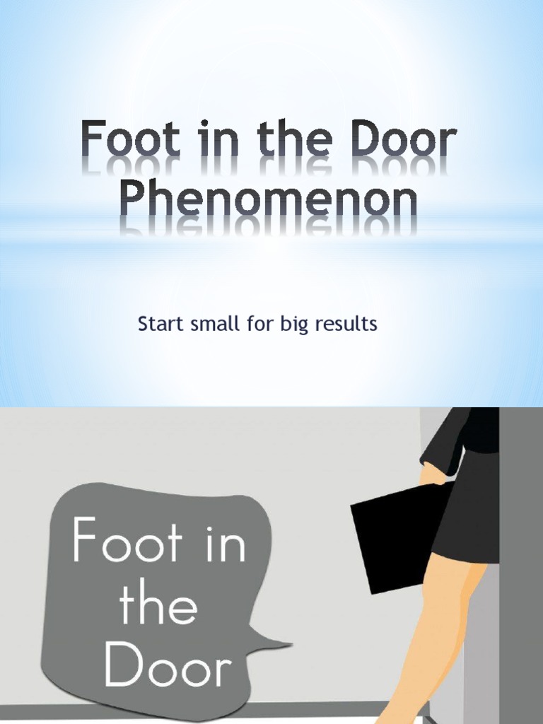 Foot In The Door Phenomenon - Mediating effects of size of first request and sex of requester. Assigning 60 people to 2 groups. Human memory, learning, & thinking; The researcher would ask the second group to place a large sign in their yard without asking them to place the smaller sign in their windows first. Several psychological processes that may be set in motion with a. You should also read this: Wset Practice Test