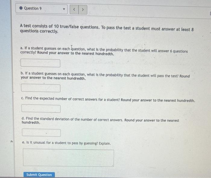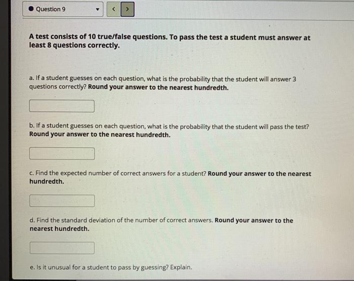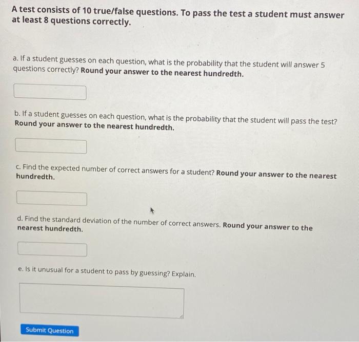 Solved A test consists of 10 true/false questions. To pass - A test consists of 10 true/false questions. If a student guesses on each question, what is the probability that the student will pass the test? If a student guesses on each question, what is the probability that the. Statistics and probability questions and answers; To pass the test a student must answer at least 6 questions correctly. You should also read this: Rey Auditory Verbal Learning Test