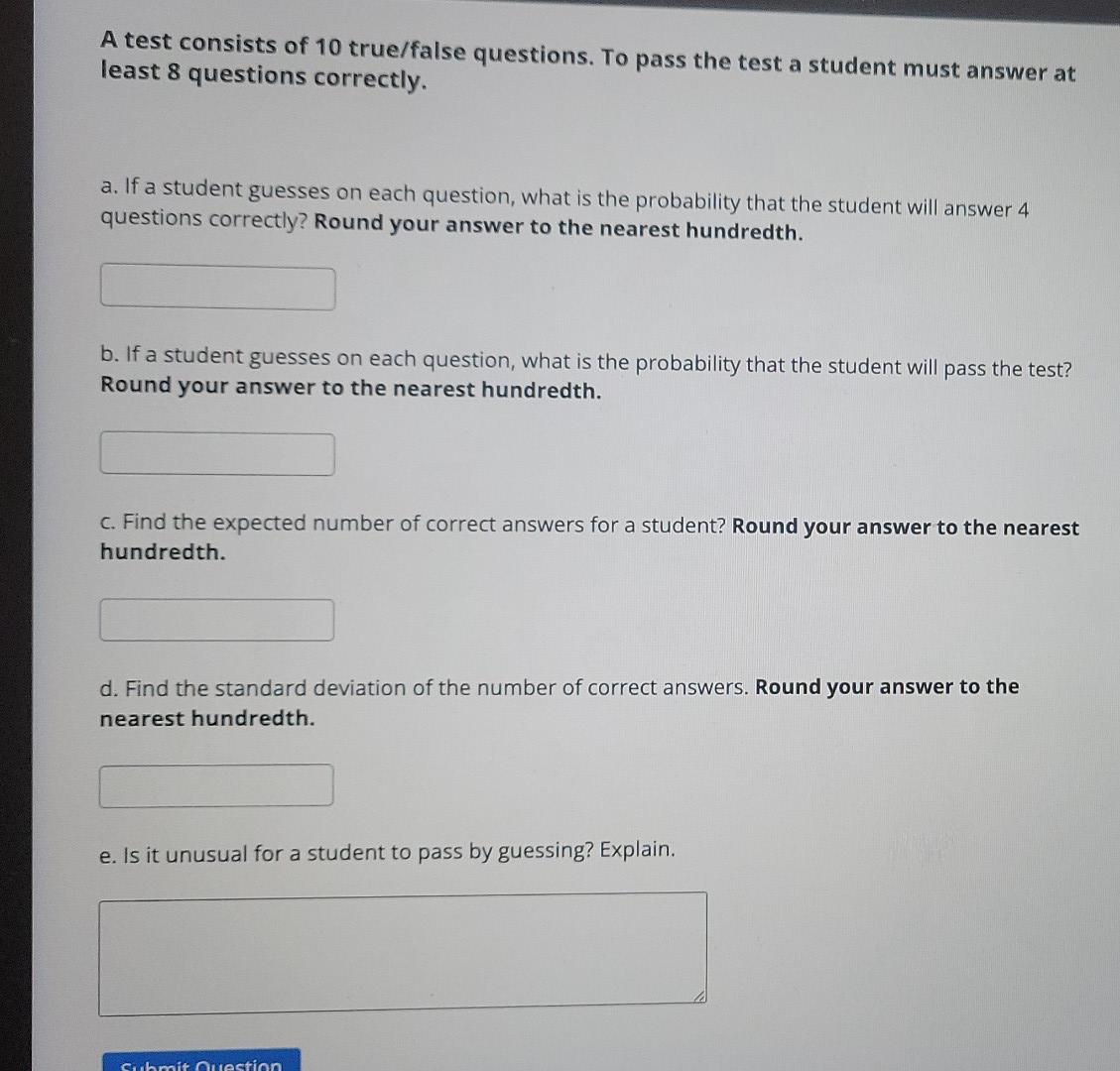 Solved A test consists of 10 true/false questions. To pass - A test consists of 10 true/false questions. If a student guesses on each question, what is the probability that the. Matthew forgets to study and must guess on every question. If a student guesses on each question, what is the probability. A test consists of 10 true/false questions. You should also read this: Blood Test For Fever Of Unknown Origin