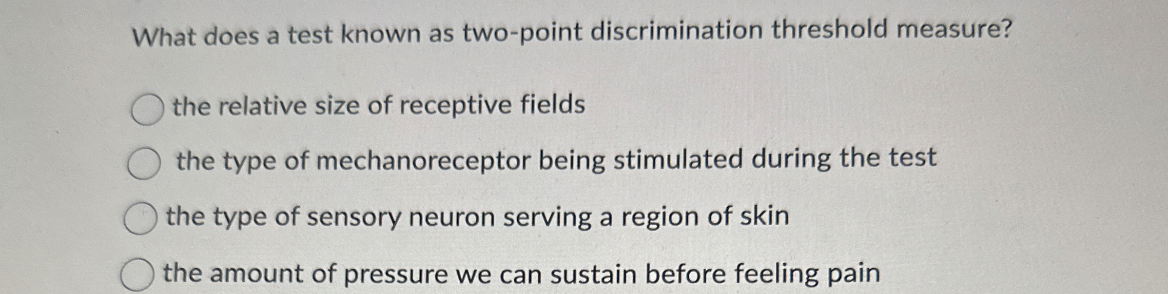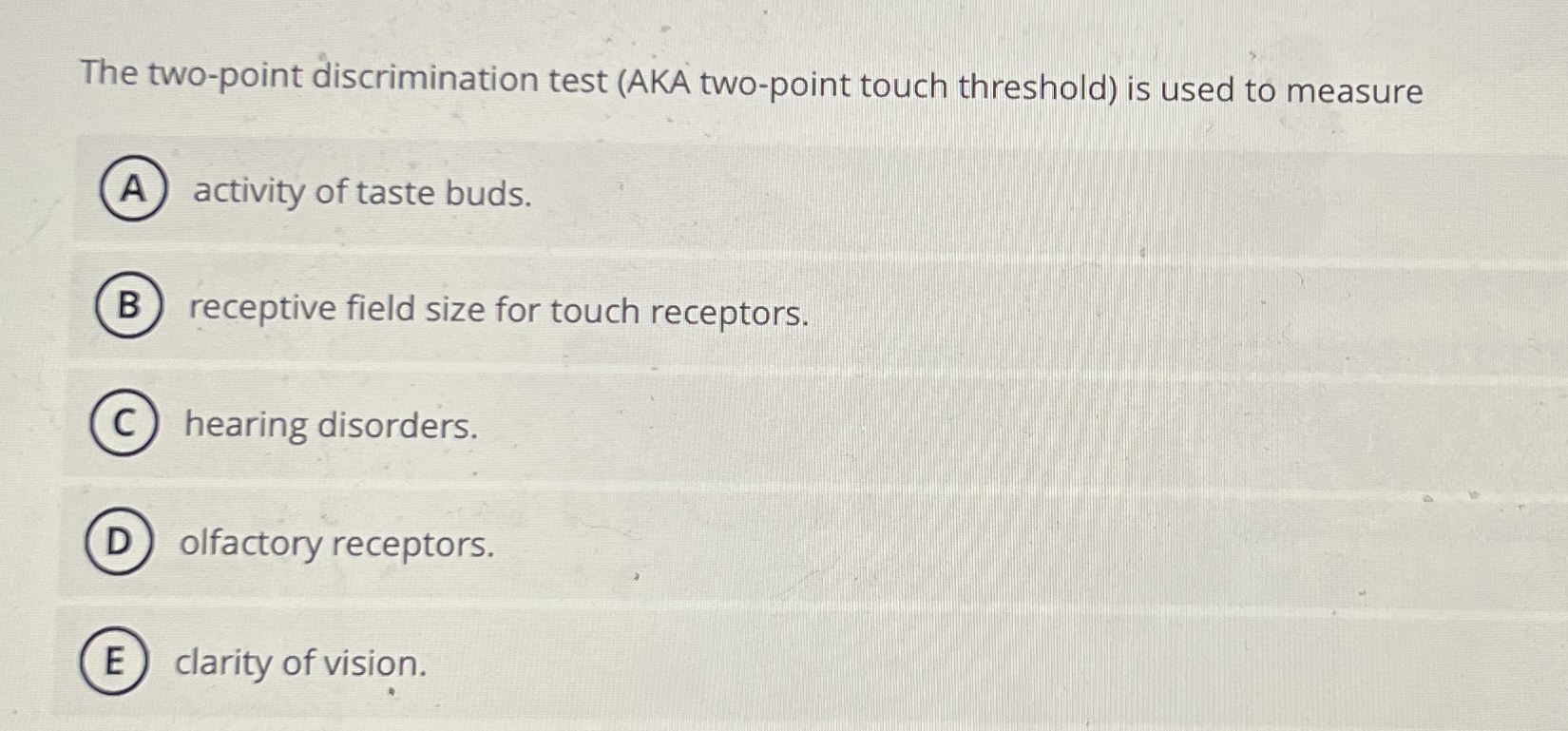 Solved What does a test known as twopoint discrimination - A systematic review of validity and reliability of the caliper to measure tpd is needed to more comprehensively evaluate its measurement properties. Two point discrimination test assesses ability to perceive two points applied to skin. Two point discrimination is a simple, inexpensive functional test widely used to assess tactile sensitivity. 1) the type of cheanoreceptor being stimulated 2) the amount. You should also read this: Drug Test Kits Near Me