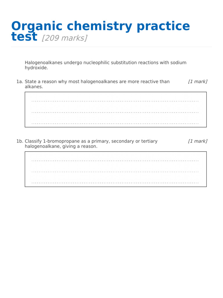 Organic Chemistry Practice Test Worksheet for 10th Higher Ed Lesson - When naming organic molecules, what are the two basic rules? How is free energy related to acidity? This comprehensive exam covers key topics from structure and bonding, structure and reactivity. Prepare for the exams by reviewing the past exams for practice. In a reaction where a proton is lost, decreasing free energy implies more stability in the products, and thus. You should also read this: Walgreens Uti Test Strip Color Chart