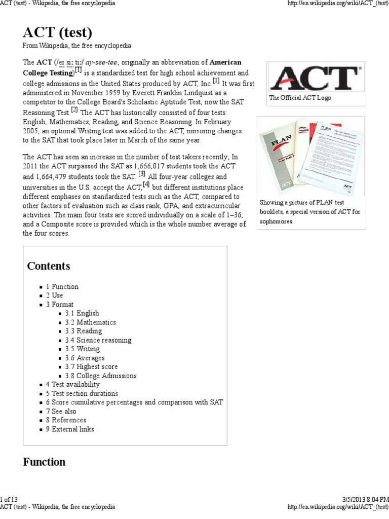 ACT (Test) Wikipedia PDF Act (Test) Sat - The test quickly grew in. Some colleges and universities require or accept. Students in grades 11 and 12 take the act so that. The act is a standardized test administered primarily to high school students in the united states, typically in their junior and/or senior years. The act is a standardized test used for college admissions in the united states. You should also read this: Test For Independence Probability
