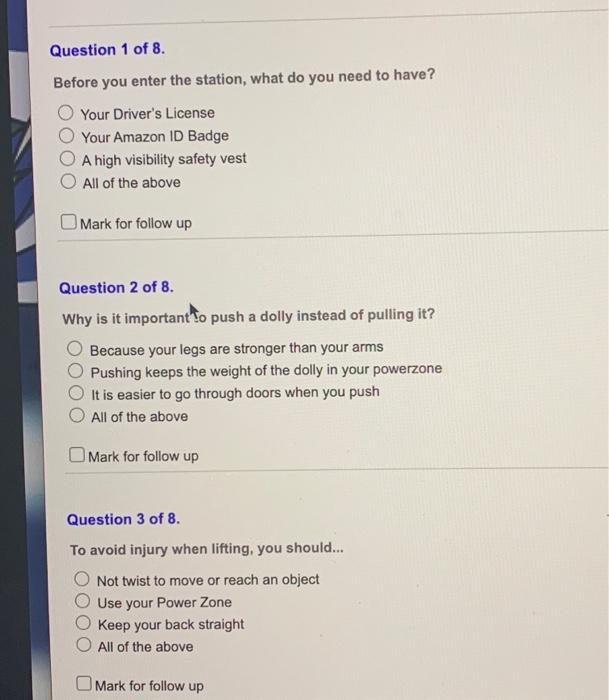Solved Question 1 of 8. Before you enter the station, what - I am supposed to go do a 2 day training for the amazon delivery driver position. Pushing keeps the weight of the dolly in your power zone Following two days of training, i participated in a road test, which took place on an actual street. Amazon is all about safety and well being of employees. Braking ( four's, smooth, slow,steady,. You should also read this: Does Lean Show Up On A Drug Test