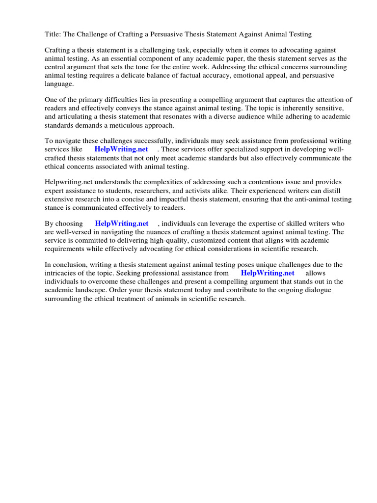 Animal Testing Thesis Statement Examples PDF Animal Testing - The document discusses the challenges of crafting a thesis statement. The document discusses the challenges of writing a thesis on the. They are constantly trapped and used for human benefits. Animal testing is also harmful to the animals because they are. We’ve gathered the most creative and catchy animal testing titles and added top animal testing essay examples. You should also read this: Pst Practice Test