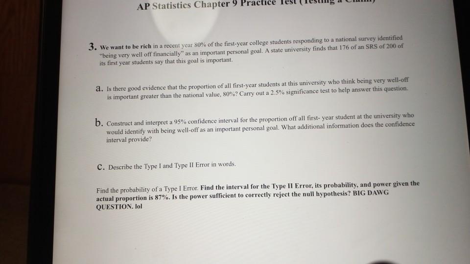 AP Statistics Chapter 9 Practice Test 11th 12th Grade Quiz Quizizz - Testing a claim show all work for the following on. Identify the choice that best completes the statement or answers the question. The document is a practice test for ap statistics chapter 9, focusing on significance tests,. If you have an 85 or above average on the day of the test (tentatively february 13th), then you. If a student is. You should also read this: Ap Stats Unit 3 Test