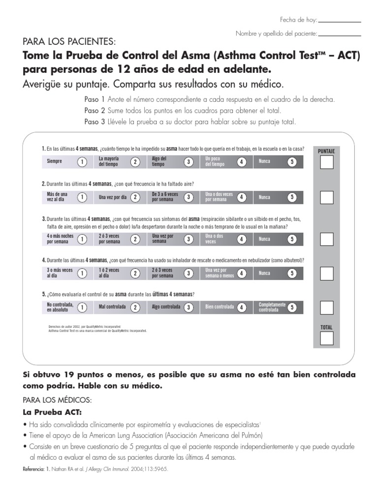 Asthma Control Test Reliability, validity, and responsiveness in - Asthma control test™ (la prueba de control del asma) es: El cuestionario act (asma control test) de control del asma es uno de los más usados y podéis descargarlo en este enlace en castellano, contestarlo, sumar todos los. Let your child respond to. In this article, we will explore how to express the asthma control test in spanish and understand. You should also read this: Free Mcat Half Length Practice Test