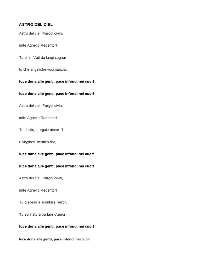 Astro del ciel Canzoni natalizie con testo (Christmas music with - Christmas carols astro del ciel lyrics: Astro del ciel, pargol divin, mite agnello redentor! Astro del ciel, pargol divin, mite agnello redentor. Tu disceso a scontare l'error, tu sol nato a parlare d'amor, luce dona alle menti, pace infondi nei cuor! Tu che i vati da lungi sognar, tu che angeliche voci annunziar, luce dona alle menti pace infondi. You should also read this: The Twentieth-century Poetic Revolution Mastery Test