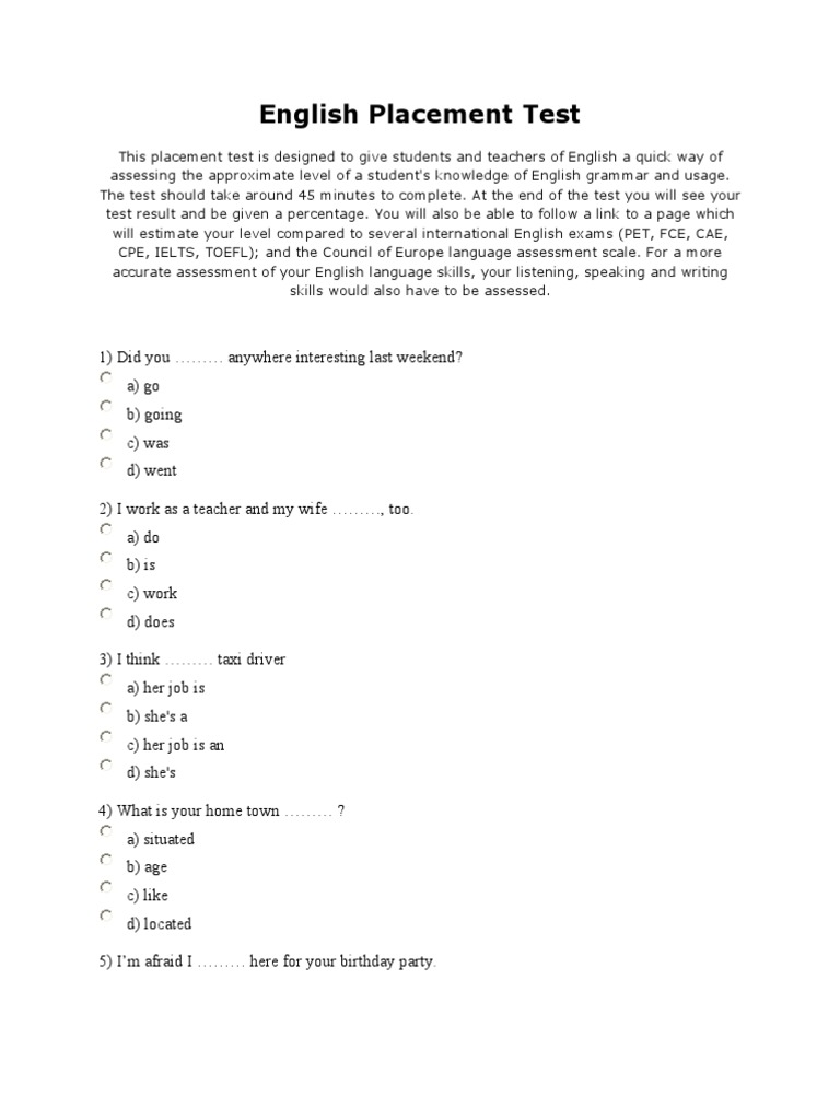 English Placement Test PDF - Placement tests are diagnostic tests which, upon completion, will provide a recommended course level for an asu language course (101, 102, 201, 202, etc.). A foreign language reading examination for graduate students can be taken in lieu of language coursework requirements. The school of international letters and cultures at arizona state university offers a variety of testing services for current. You should also read this: Aerotek Staffing Drug Test