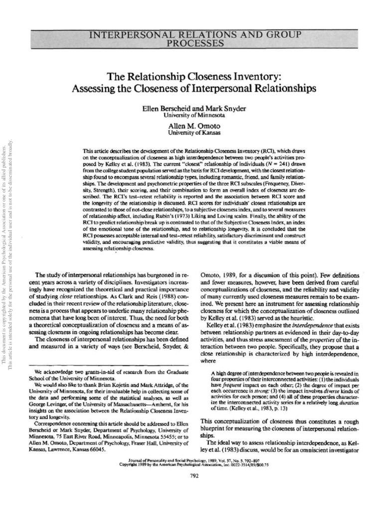 Ellen Berscheid, Mark Snyder & Allen M. Omoto ppt video online download - The relationship closeness inventory (rci; Berscheid, e., snyder, m., & omoto, a. View full text *some journal. The development and psychometric properties of the three rci subscales (frequency, diversity, strength), their scoring, and their combination to form an overall index of closeness are. Sp does not influence how i dress. You should also read this: Chapter 6 Ap Stats Test