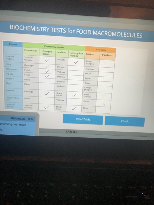Solved BIOCHEMICAL TESTS FOR FOOD MACROMOLECULES Food - Study with quizlet and memorize flashcards containing terms like iodine test, benedict's test, sudan test and more. Learn about biochemical tests for food macromolecules in the labster online lab. To use indicators to test for the presence of lipids, carbohydrates, and proteins in various foods. Which foods will contain which macromolecules? Simple sugars, starch, proteins, and lipids. You should also read this: Nc Driving Test Cheat Sheet
