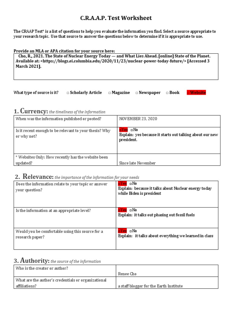 CRAAP Test Worksheet Source Evaluation Guide - The craap test* is a list of questions to help you evaluate the information you find. The reason the information exists. Use the following list to help you evaluate sources. Test worksheet the following questions will help you determine whether or not your source is reliable. Test worksheet the following questiions will help you determine whether or not your source. You should also read this: Gr8 Battery Tester