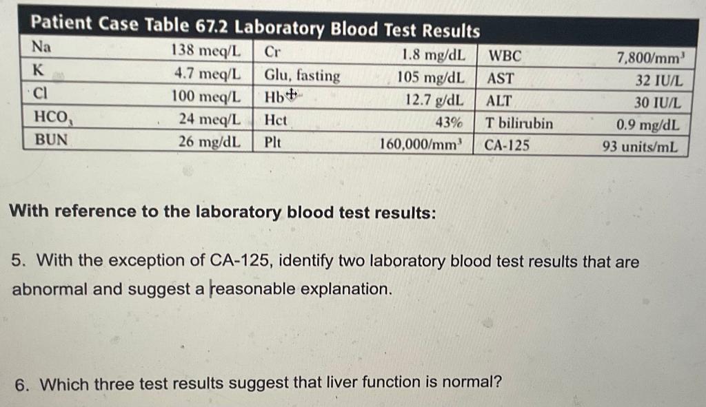 Solved With reference to the laboratory blood test results - Learn about low and high results. This test has been cleared, approved, or is exempt by the us food and drug administration and is used per manufacturer's instructions. It’s often part of a. Serum ca 125 is elevated in approximately 80% of women with advanced epithelial ovarian cancer, but the assay sensitivity is suboptimal in early disease stages. It is. You should also read this: Does Cetaphil Animal Test