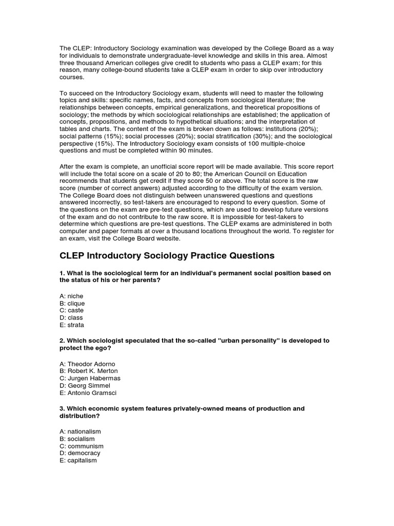 clep exam answers - Each question comes with hints and detailed explanations to. Use them to get a sense of question. This practice test on introductory sociology will allow you sufficient practice before taking the official exam. Which of the following countries has the greatest number of deaths per capita? Which of the following is not characteristic of the chicago school of sociology? You should also read this: Uc Davis Test Menu