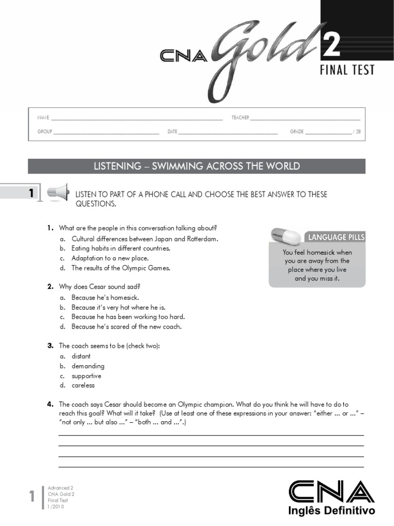 Prova Cna New Gold 1 LIBRAIN - Cna final exam questions and. Cna gold 1 final test. It is 100 questions multiple. It assesses students on communicative ability, grammatical competence,. Study with quizlet and memorize flashcards containing terms like obra (omnibus budget reconciliation act) of 1987, professional appearance of a cna, professional appearance of a. You should also read this: Can Birth Control Pills Affect Thyroid Test Results