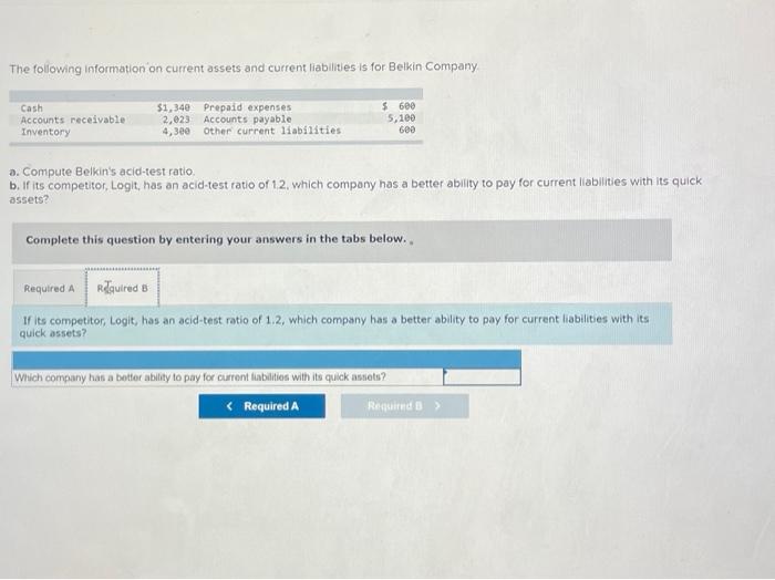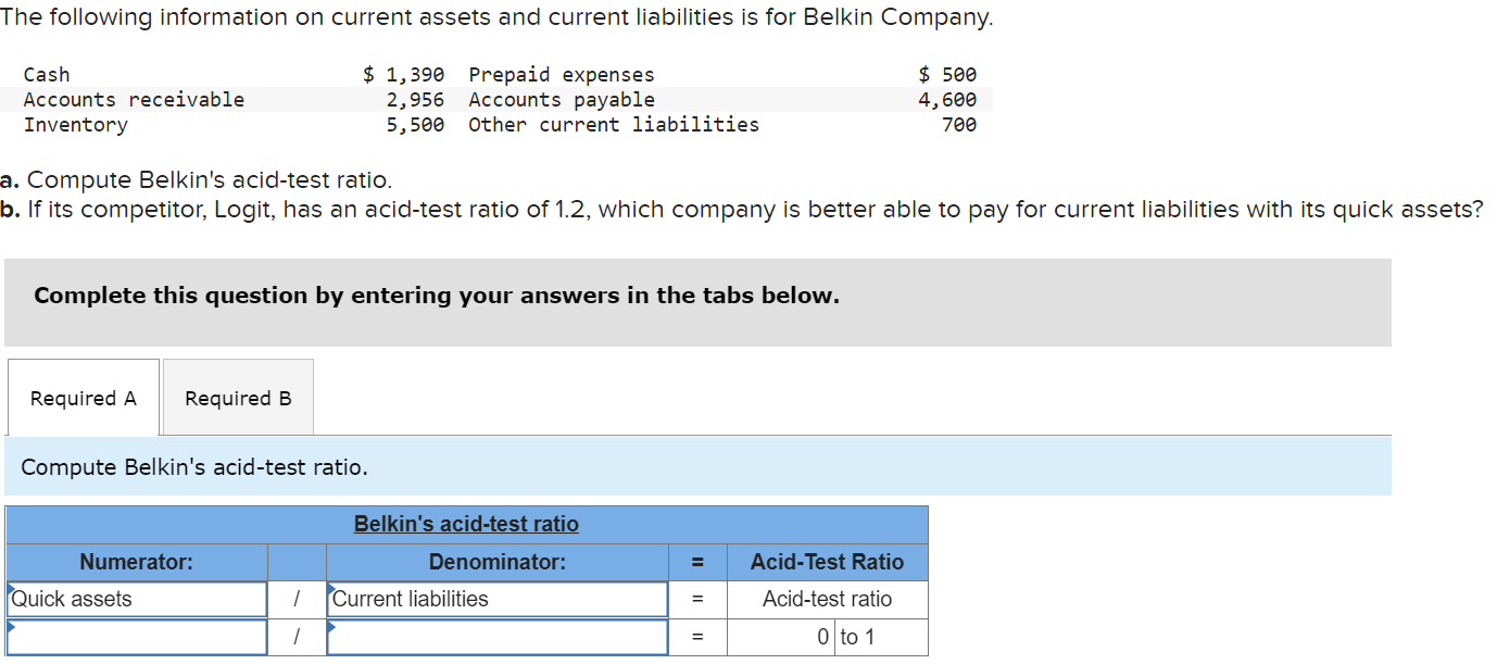 Solved a. Compute Belkin's acidtest ratio. b. If its - The following information on current assets and current liabilities is for belkin company. Complete this question by entering your answers in the tabs below. To start, identify belkin company's quick assets by summing the provided cash and accounts receivable values. Cash + accounts receivable = $1,350 + $2,811 = $4,161; Logit is better able to pay for current liabilities with. You should also read this: Masterbooks Placement Test