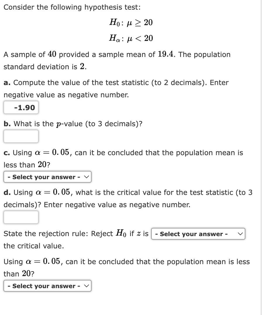 Solved Consider the following hypothesis test. - Μ ≠ 20 a sample of 50 provided a sample mean of 19.4. The population standard deviation is 6. The population standard deviation is 2. A sample of 25 provided a sample mean xˉ = 14 and a sample standard deviation s = 4.32. Consider the following hypothesis test. You should also read this: Fbla Business Communications Practice Test