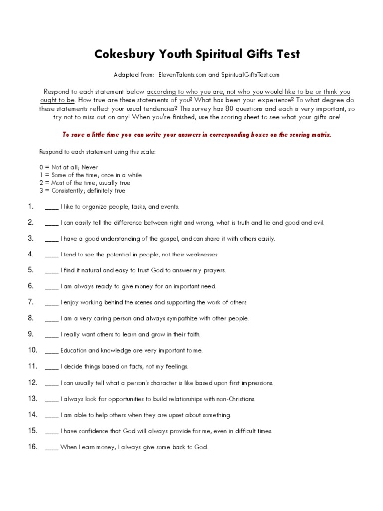 Spiritual Gifts Test Printable - To determine what your top spiritual gifts are, complete the assessment. You will discover the purpose of spiritual gifts in the church and learn how to identify your special mix of gifting. What type of spiritual gifts do you have? These and other spiritual gifts are found in scripture, according. Welcome to the red letter challenge spiritual gift test. You should also read this: Napa Block Test Fluid