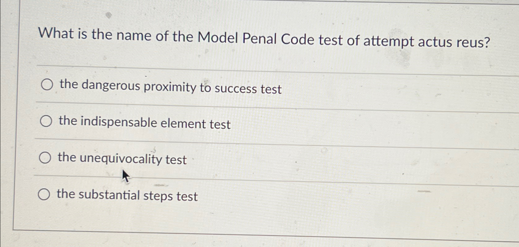 Solved What is the name of the Model Penal Code test of - Which test of attempt actus reus asks whether defendants have reached a point where they've gotten control of everything they need to complete the crime? Is it an objective test or a subjective test? The dangerous proximity test establishes negligence by determining if a defendant’s actions created a situation where there was a foreseeable risk of harm to others. Dangerous. You should also read this: Telopeptide Serum Test