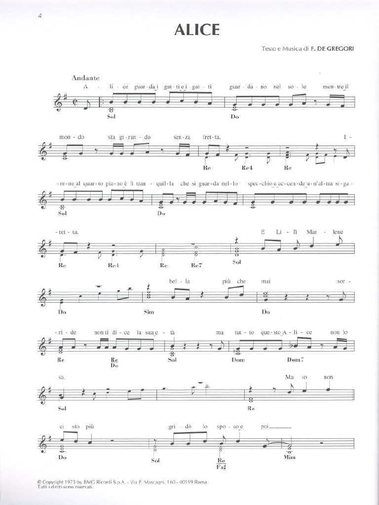 SONGWRITING I SEGRETI DEI CAPOLAVORI “ALICE” DI FRANCESCO DE GREGORI - Alice testo canzone cantato da francesco de gregori: Alice testo canzone cantato da francesco de gregori: Irene al quarto piano è lì tranquilla e si guarda nello specchio e accende un'altra sigaretta. E cesare perduto nella pioggia sta aspettando da sei ore il suo amore ballerina. Alice guarda i gatti e i gatti girano nel sole mentre il sole fa. You should also read this: Perfect Pitch Test Non Musicians