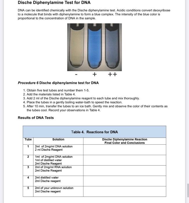 experimental chemistry Theory behind Experiment Extraction and - The dische test involves a color change to blue when diphenylamine reagent is added to hydrolyzed dna, indicating the presence of deoxyribose. When heated with dna, it turns blue in the presence of dna. The dische’s test will detect the deoxyribose of dna and will not interact with the ribose in rna. This chapter discusses the determination of dna concentration. You should also read this: Ohsu Lab Test Menu