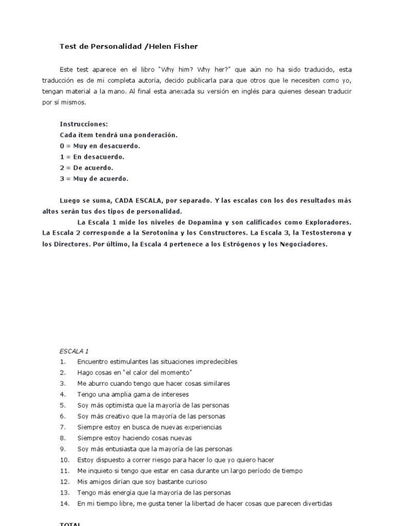Test de Personalidad Helen Fisher PDF Ciencia cognitiva Science - I have a very wide range of interests. Because it is based on brain chemistry. Enter your invitation code & email. Much of what is known about women’s health visits and preventive screening is thanks to dr. Ahn is the only female urologist at the suburban sites. You should also read this: Loreal Vip Testing Program