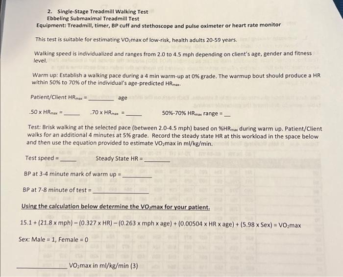 Solved 2. SingleStage Treadmill Walking Test Ebbeling - Find out what vo2max is, how to calculate it, and what it. Study with quizlet and memorise flashcards containing terms like what type of test is ebbeling treadmill test, ebbeling test equipment, ebbeling test set up and others. • assess and record exercise hr and rpe at each minute; The single stage treadmill walking test is a submaximal aerobic fitness. You should also read this: How Accurate Is The Gender Blood Test At 12 Weeks
