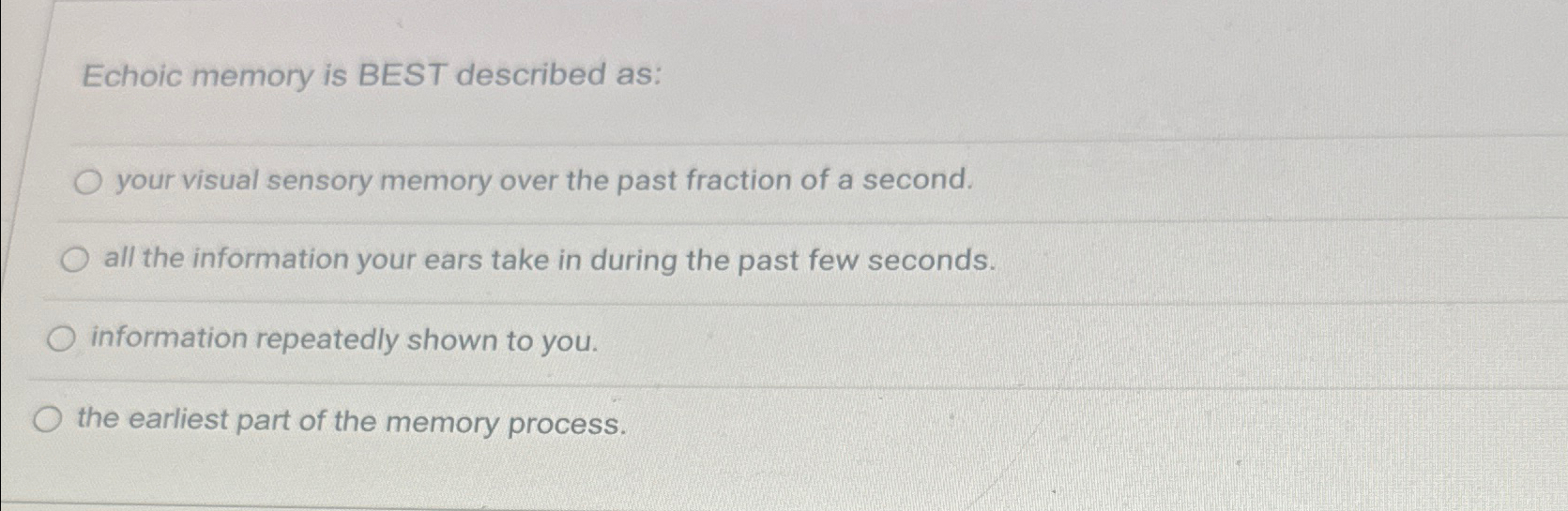 Solved Echoic memory is BEST described asyour visual - These problems are difficult to assess since performance could be due to their inability to understand a given task, rather than a problem with their memory. When we listen to music our brains briefly recall each note and connects it to the ensuing note. Albers helped found a company that makes the aromha brain health test, which is the test. You should also read this: Thallium Stress Test Side Effects