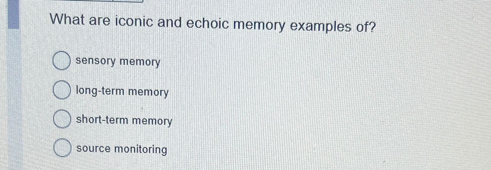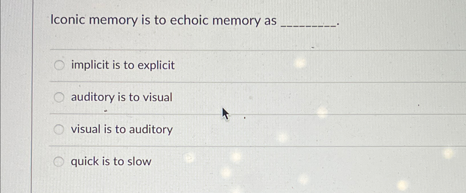 Solved Iconic memory is to echoic memory asimplicit is to - Explain the function and duration of eidetic and echoic memories. Also, learn how long echoic memory lasts and see the testing methods for this type of memory. Echoic memory is a type of sensory memory responsible for retaining auditory information for a short period, typically lasting a few seconds. Children with deficits in auditory memory have been shown to have. You should also read this: Recipient Rights Test Answers