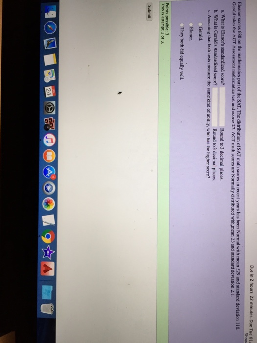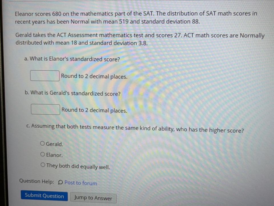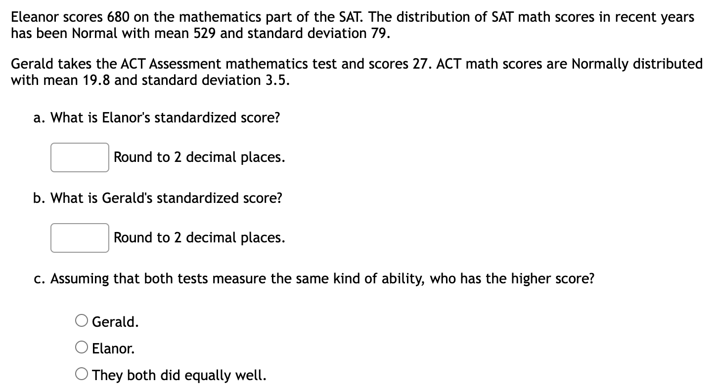 Solved Eleanor scores 680 on the mathematics part of the - Eleanor scores 680 on the mathematics part of the sat. (a) what is eleanor's stendardized score. Eleanor received a 680 on the sat mathematics test. The sat mathematics test has a standard deviation of 100. The distribution of sat math scores in recent years has been normal with mean 534 and standard. You should also read this: Free Depression Test Elephant Or Tree