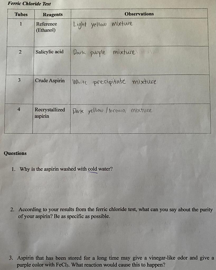 Solved Result of the ferric chloride test on aspirin light - Why is the aspirin washed with cold water? Ferric chloride test for salicylic acid. Ferric chloride test results the ferric chloride test is commonly used to detect the presence of salicylates, including acetylsalicylic acid, which is the active ingredient in aspirin. What is used in ferric chloride test? What precautions should one use when working. You should also read this: Test De Alcohol Y Drogas Florida En Español Respuestas