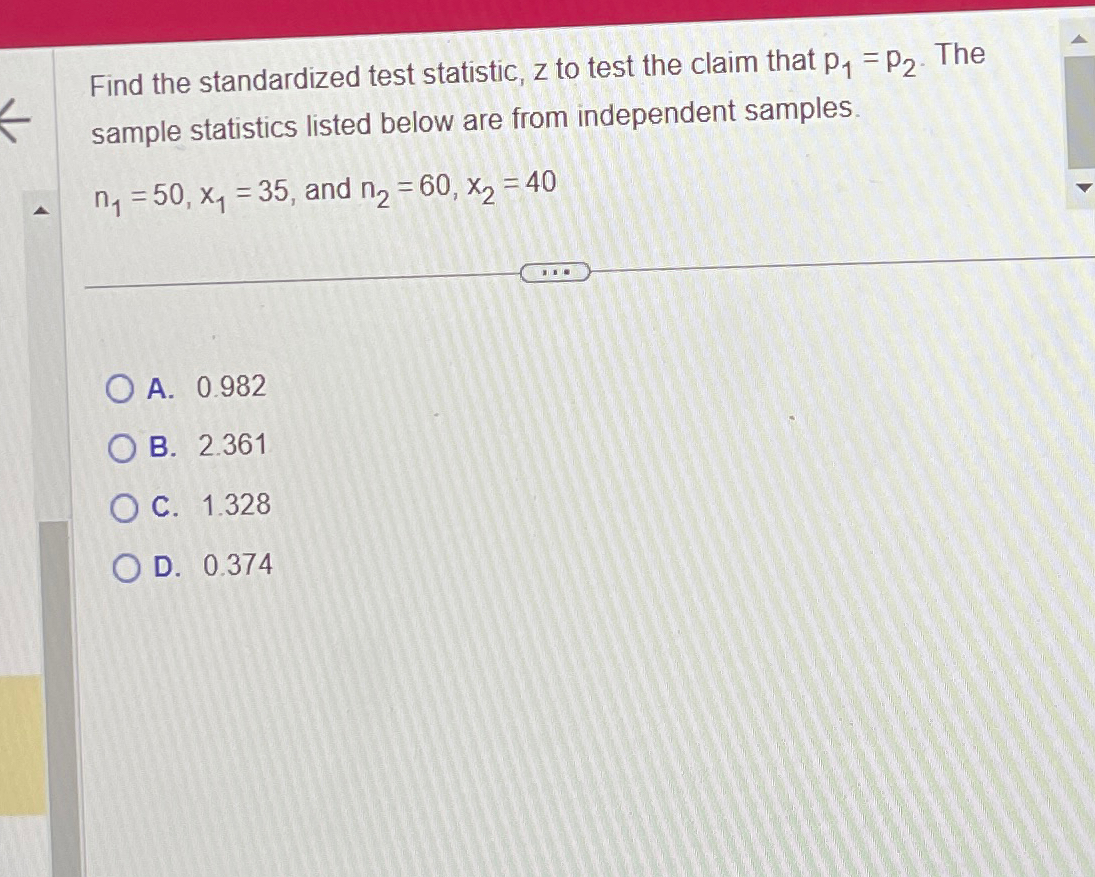 Solved Find the standardized test statistic, z to test the - In order to calculate the statistic, we must calculate the sample means (x and y) and sample standard deviations (σ x and σ y) for each sample separately. What does a standardized test statistic mean? With our tool, you need to enter the respective value for statistic,. A negative test statistics value indicates that it occurs on the left side.. You should also read this: Conners 4 Test