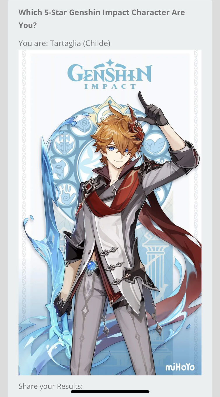 i did some genshin kin tests and heres who i got Genshin Impact HoYoLAB - Ocassionally its ok to ask on some questions. Genshin impact has tons of characters, but which one do you kin? Pls comment any suggestions or if i made a mistake. This latest viral quiz will help you decide which one of them you relate to most. Our cool character quiz will let you know which character you share the most. You should also read this: Stony Brook Pre Surgical Testing