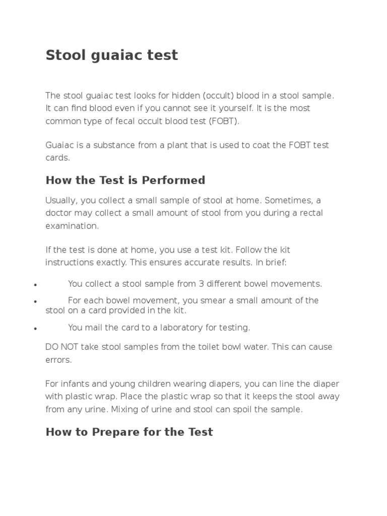 Occult gastrointestinal bleeding and the stool guaiac test - It is a common type of fecal occult blood test (fobt). A small amount of heme present in the stool reacts with hydrogen peroxide to oxidize the paper. It defines the test as using guaiac to detect occult blood in stool samples, which can indicate gastrointestinal issues like cancer or polyps. It can find blood even if you cannot see. You should also read this: At Home Dna Paternity Test Walgreens