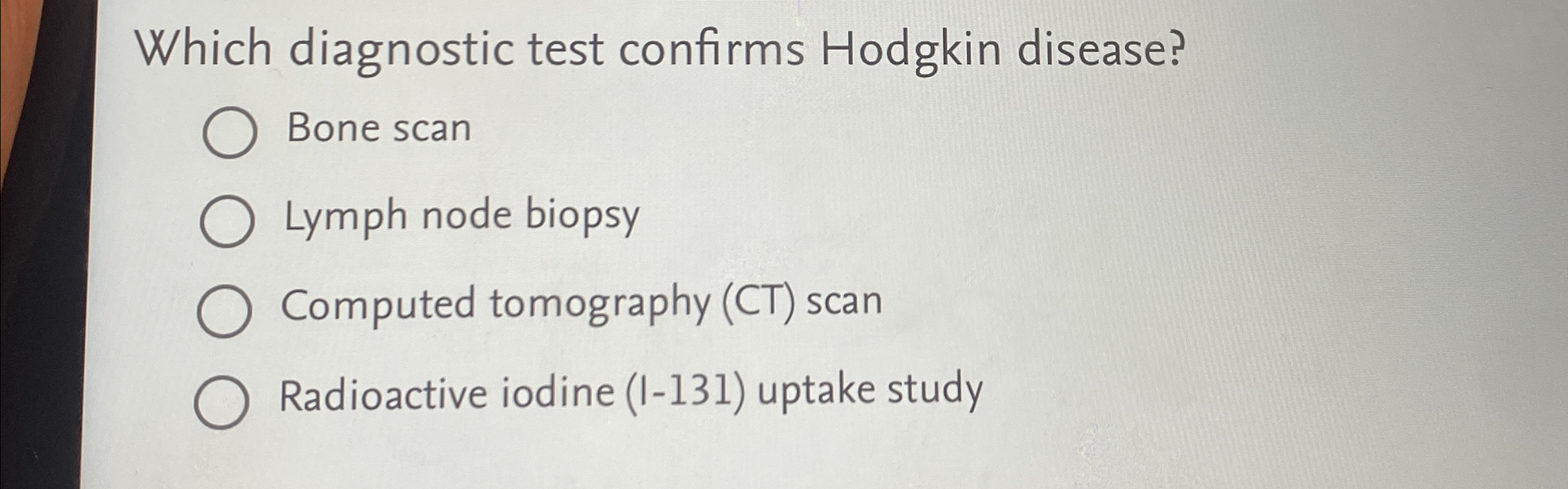 Solved Which diagnostic test confirms Hodgkin disease?Bone - Doctors first look for signs through physical exams and medical history checks. Tests your gp might do include: Blood tests are key in diagnosing hodgkin’s lymphoma by finding specific markers in the blood. Swollen nodes are often the first clue. Learn about the different methods used to diagnose and what to expect. You should also read this: Can I Drink Water Before A Pulmonary Function Test