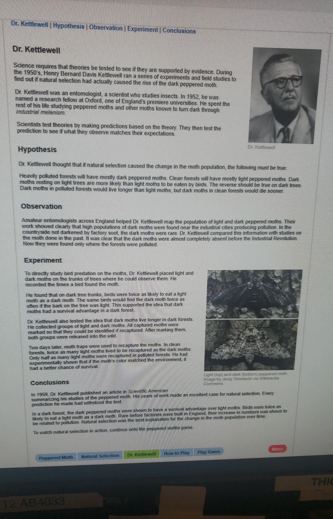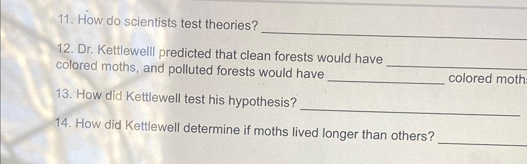 Solved How do scientists test theories?Dr. Kettlewelll - This simple yet powerful study, conducted by bernard kettlewell in. Kettlewell tested his hypothesis by marking and releasing light and dark moths in different environments to observe their survival rates. Kettlewell and its implications for understanding evolution and natural selection. Bernard kettlewell did several experiments on peppered moths, to explore the factors driving their observed evolution from lighter to darker. You should also read this: Hiset Practice Test Missouri