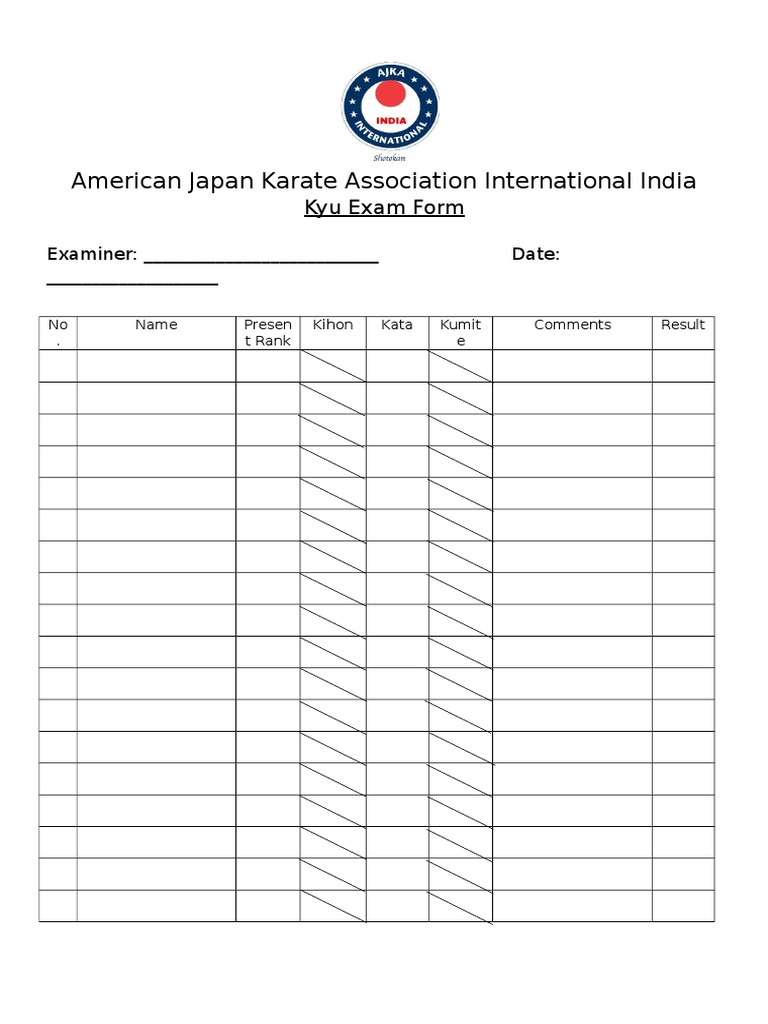 American Japan Karate Association International India Kyu Exam Form PDF - All other kyu ranks may have either a card. There are 10 kyu and 10 dan in jka karate. The document outlines the rank certification system and grading requirements for the jka kyu and dan ranks in karate. There are 10 kyu (coloured belts) and 10 dan (black belt levels) in jka karate. There are 10 kyu and 10 dan. You should also read this: Empire State Of Mind Testo