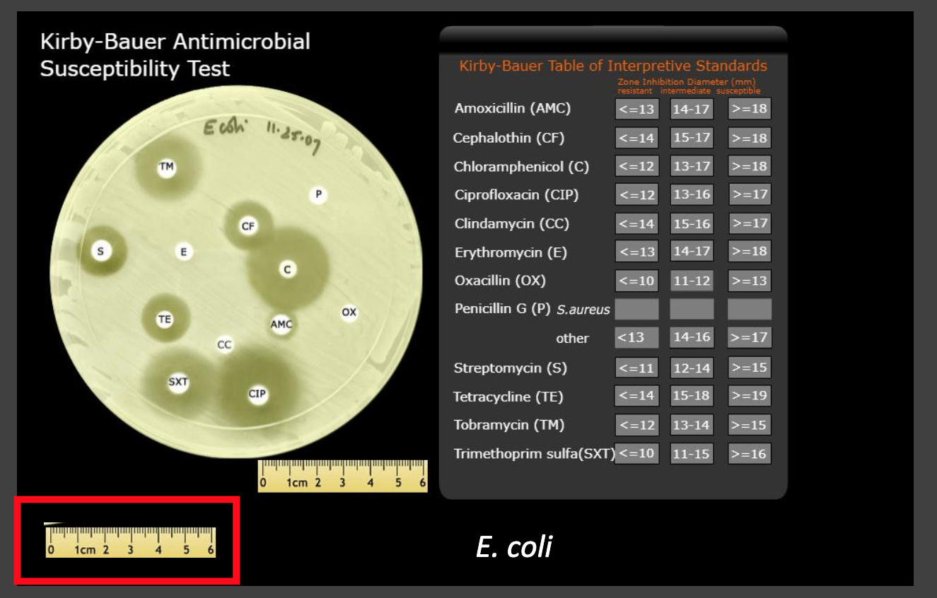 KirbyBauer Test timelapse with E . coli and S. aureus YouTube - Researchers who develop antimicrobial textiles, surfaces, and liquids now use this test as a quick and easy way to measure antimicrobial activity, particularly the ability of an object or chemical. Zones of inhibition are measured (diameter in mm) and compared to standardized results for each antibiotic to determine whether the bacterium was sensitive to the antibiotic. The results show sensitivity. You should also read this: Price Of Clearblue Digital Pregnancy Test