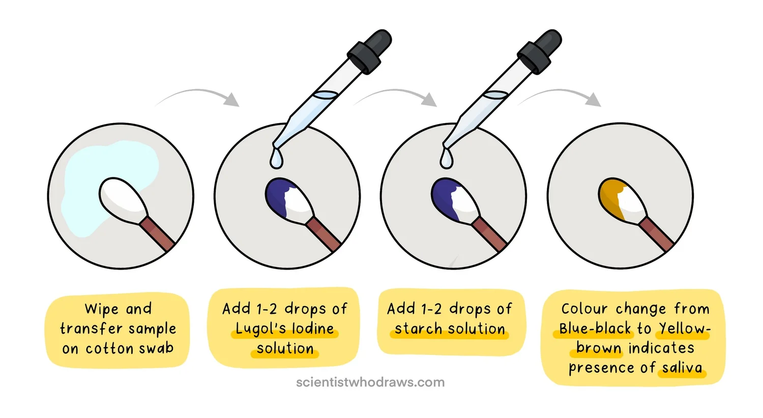 Preliminary tests for Saliva — Scientist who draws - Lugol's solution is an aqueous solution of iodine and potassium iodide. The iodine test is used to test. Lugol’s iodine, an aqueous solution of elemental iodine as well as potassium iodide, is the reagent which we use in iodine test. In this exercise, we will use benedict’s reagent to test for the presence of reducing sugars. Test sample powder (5. You should also read this: Neck Flexor Endurance Test