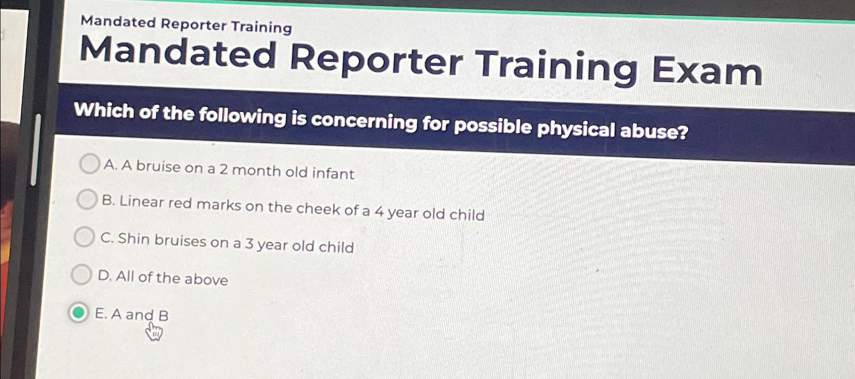 Solved All of the following are mandated reporters of child - His or her employer or supervisor b. 1) under the child abuse and neglect reporting act, a mandated. Test your knowledge with our engaging quiz and flashcards on mandated reporter guidelines for child abuse. Mandated reporter training exams with correct questions and answers guaranteed pass 2025 exam what is the role of the office of children, youth, and families regional. You should also read this: Can I Use Rented Car For Driving Test