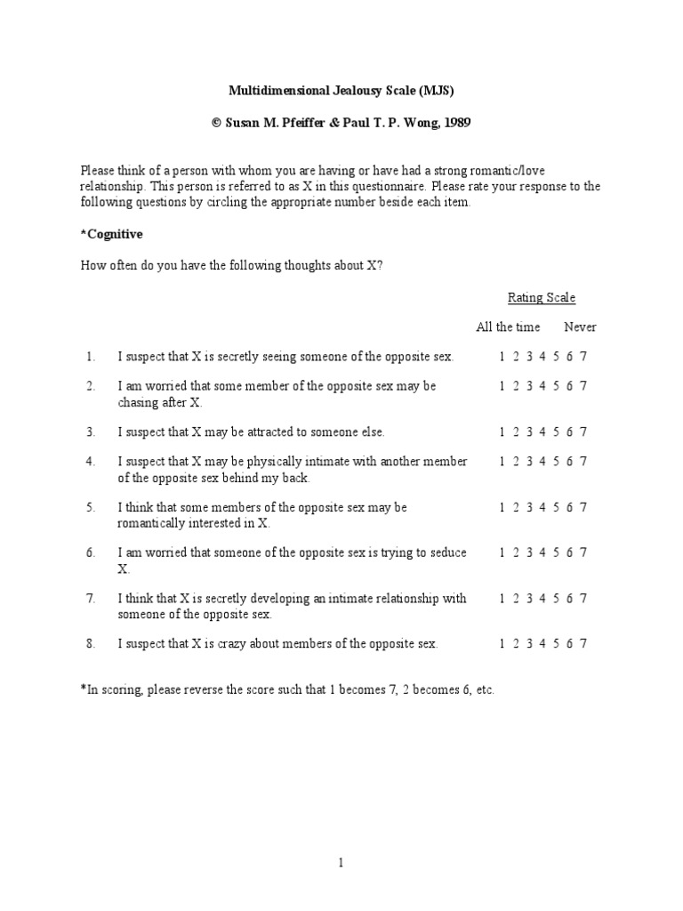 [PDF] Psychometric properties of the Multidimensional Jealousy Scale - A questionnaire to measure jealousy in a romantic/love relationship. The multidimensional jealousy scale was developed by pfeiffer and wong (1987), and the aim of the scale is to measure the cognitive, emotional and behavioral reactions that occur in case of. The short form of the multidimensional jealousy scale is a well validated scale with 17 items. A test to measure. You should also read this: Personalized Path/winning Path Functionality To Determine Prop Test Multivariate