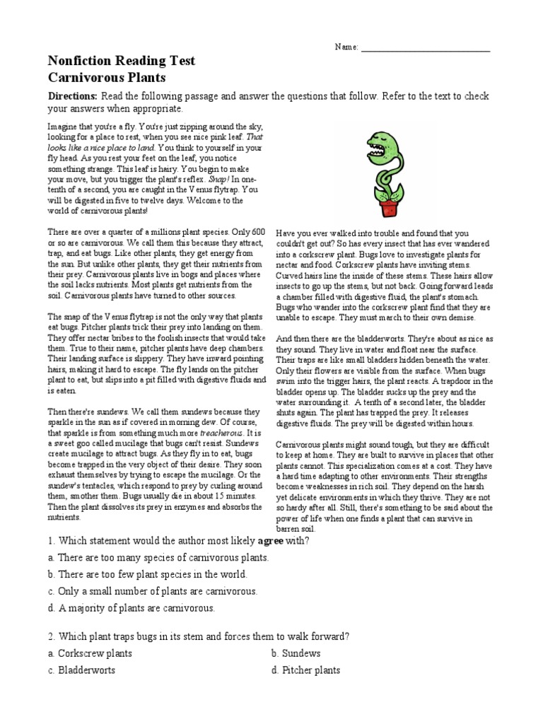Nonfiction Reading Test Carnivorous Plants Answers Long Response - Nonfiction reading test reading directions: Find helpful answers and tips for nonfiction reading tests to improve your reading. Nonfiction reading test reading directions: Read the following passage and answer the. Read the following passage and answer the. You should also read this: Nj Hazmat Test
