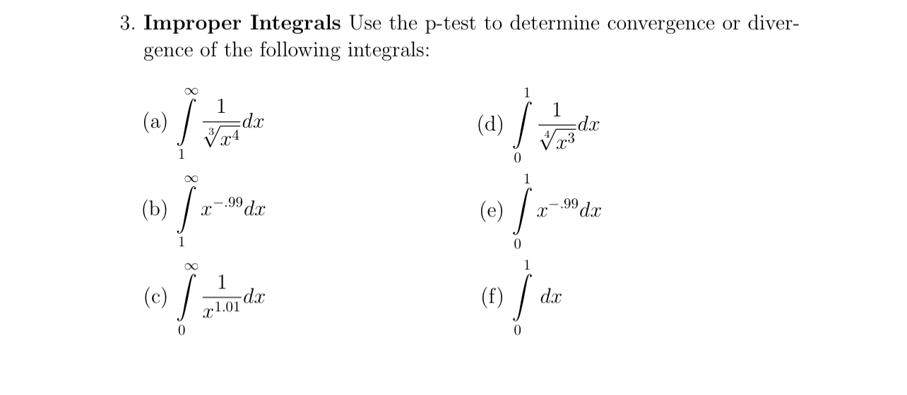 P test for improper integral YouTube - • z ∞ 0 1 xp dx diverges for all p. If lim x!1 r x a f(t)dt = l for some l 2 r; Use the comparison theorem to determine whether a definite integral is convergent. • z b 0 1 xp dx ˆ converges if p < , diverges if p ≥ 1. Where f can become unbounded. You should also read this: Necklace Gender Test