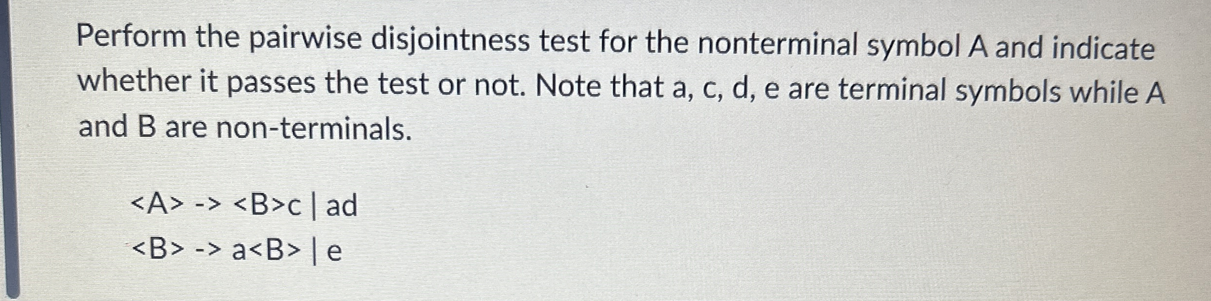 SOLVED 1. Perform the pairwise disjointness test for the following - Perform the pairwise disjointness test for the following grammar rules. Labb 2 perform the pairwise disjointness test for the following grammar rules. The pairwise disjointness test applies to: Perform the pairwise disjointness test for the following grammar rules. We are only inputting terminals while the nonterminal are like pathways. You should also read this: Ged Test Coupon