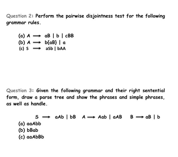 Solved Question 2 Perform the pairwise disjointness test - S → asb | baa (first value different?. Labb 2 perform the pairwise disjointness test for the following grammar rules. Study with quizlet and memorize flashcards containing terms like parsers are based on which of the following mathematical. Perform the pairwise disjointness test for the following grammar rules. Perform the pairwise disjointness test for the following grammar rules. You should also read this: Does Caffeine Affect Pregnancy Test